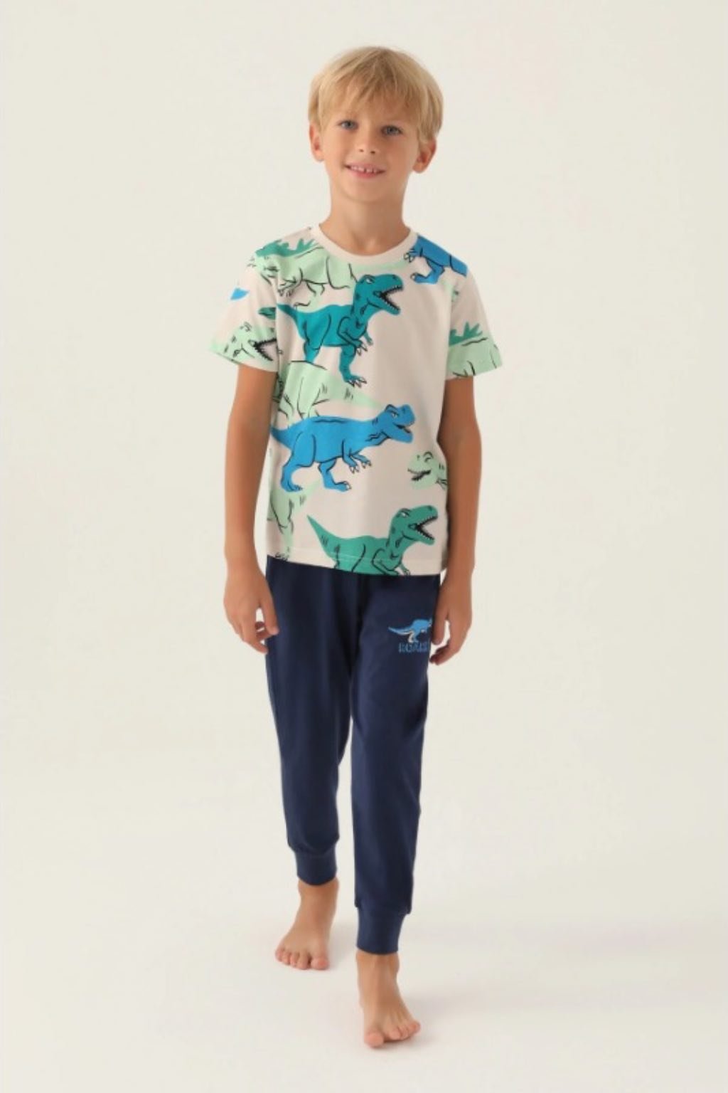 Chlapčenský pyžamový komplet ROLYPOLY RP3360 je skvelou voľbou pre malých milovníkov dinosaurov. Horný diel tvorí tričko s krátkym rukávom v krémovej farbe s výraznou a hravou potlačou dinosaurov v odtieňoch modrej a zelenej. Tričko má klasický okrúhly výstrih a je vyrobené z príjemného, priedušného materiálu, ktorý zabezpečuje pohodlie počas celého dňa aj noci.
