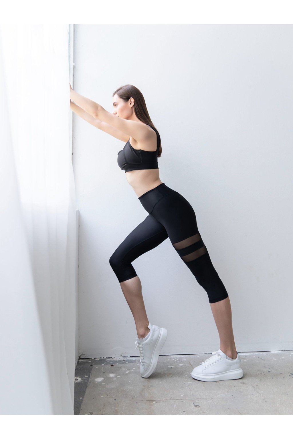 1003 Capri Leggings s tylom od značky LISMINA sú určené ženám, ktoré chcú pri pohybe nielen pohodlie, ale aj štýl. Elegantná čierna farba a priehľadné tylové panely po bokoch stehien robia z týchto legín výnimočný kúsok, ktorý pôsobí moderne a sexy – no stále športovo a funkčne.
