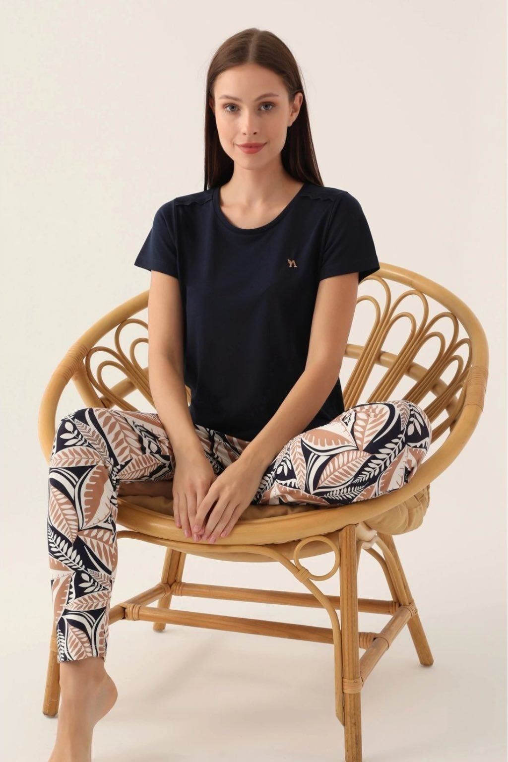 Dámske pyžamo značky Arnetta je skvelou voľbou pre ženy, ktoré hľadajú pohodlné a moderné oblečenie na spanie aj domáce nosenie. Tento dámsky pyžamový set pozostáva z jednofarebného trička s krátkym rukávom a dlhých nohavíc so štýlovým vzorom, ktoré spolu vytvárajú harmonický a elegantný vzhľad.