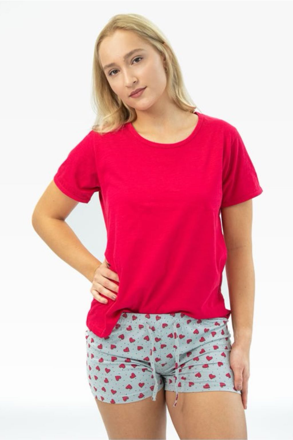 Dámske letné pyžamo GINA 19144 – červené tričko a šortky so srdiečkami