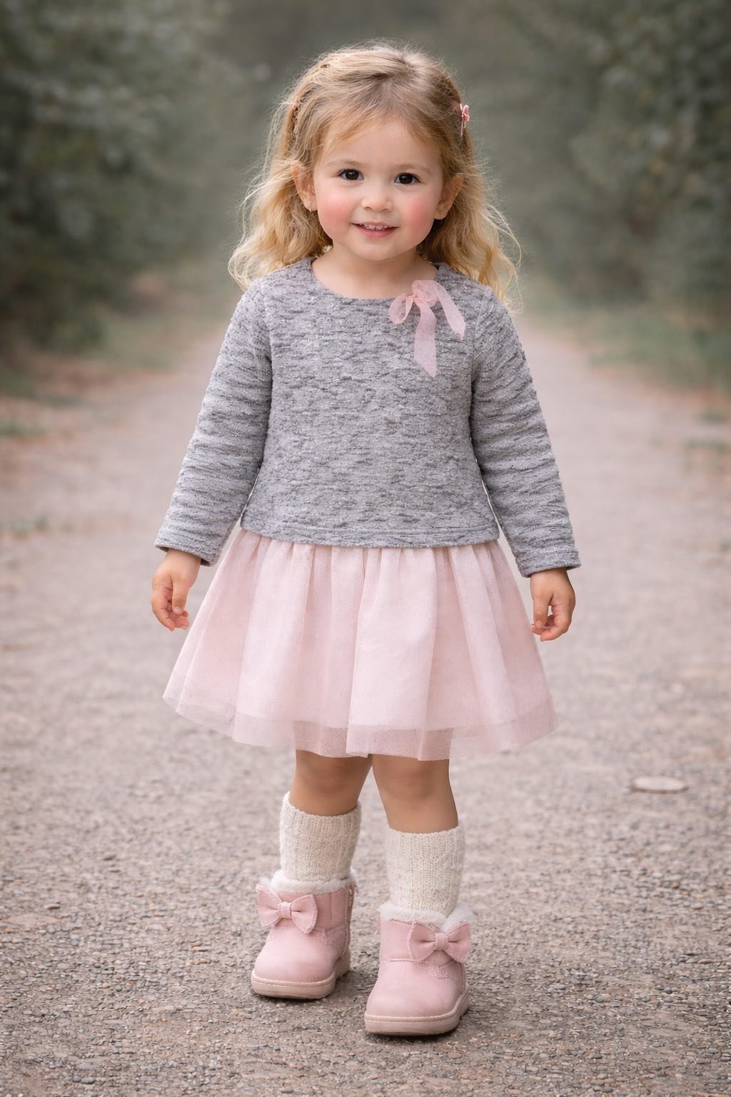 Spodná časť šiat tvorí ľahká sukňa v slabo ružovej farbe, ktorá dodáva modelu jemnosť a dievčenský vzhľad. Dlhé rukávy zabezpečujú pohodlie aj počas chladnejších dní.