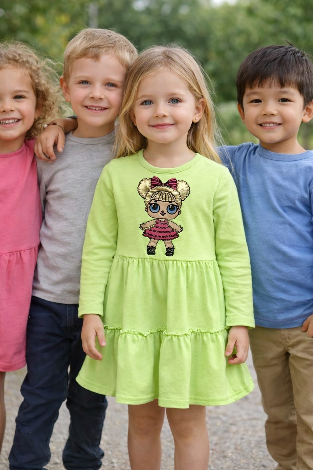 Tieto štýlové detské šaty s dlhým rukávom v sviežej zelenej farbe si zamiluje každé dievčatko. Prednú časť zdobí výrazná výšivka obľúbenej bábiky LOL, ktorá dodáva šatám hravý a moderný vzhľad.