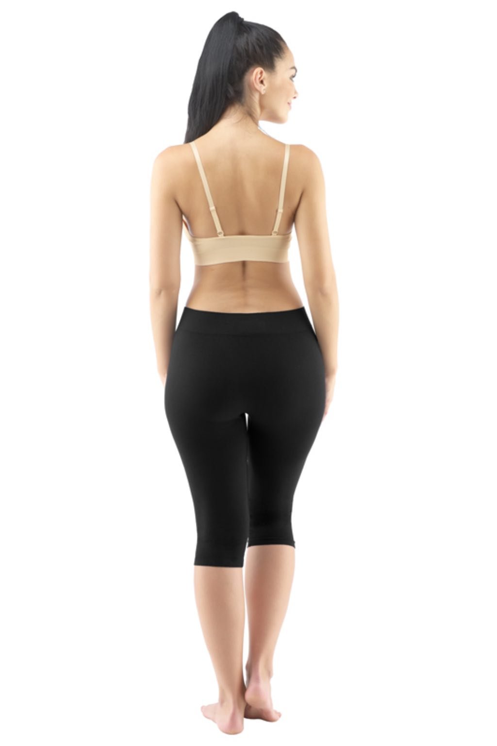 Capri legíny, dámske a pánske bezšvové športové prádlo. V záložke je vypletené logo v šedej farbe. Svojím strihom, použitým materiálom aj čiernou farbou sú tieto legíny veľmi univerzálne. Dajú sa nosiť ako pri športe, tak aj v lete k dlhším tričkám ako moderná alternatíva legín.