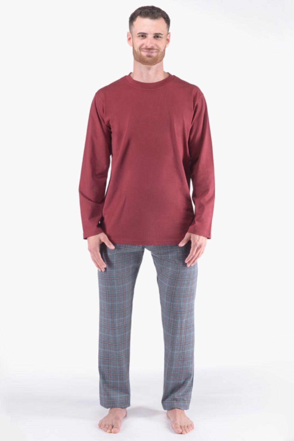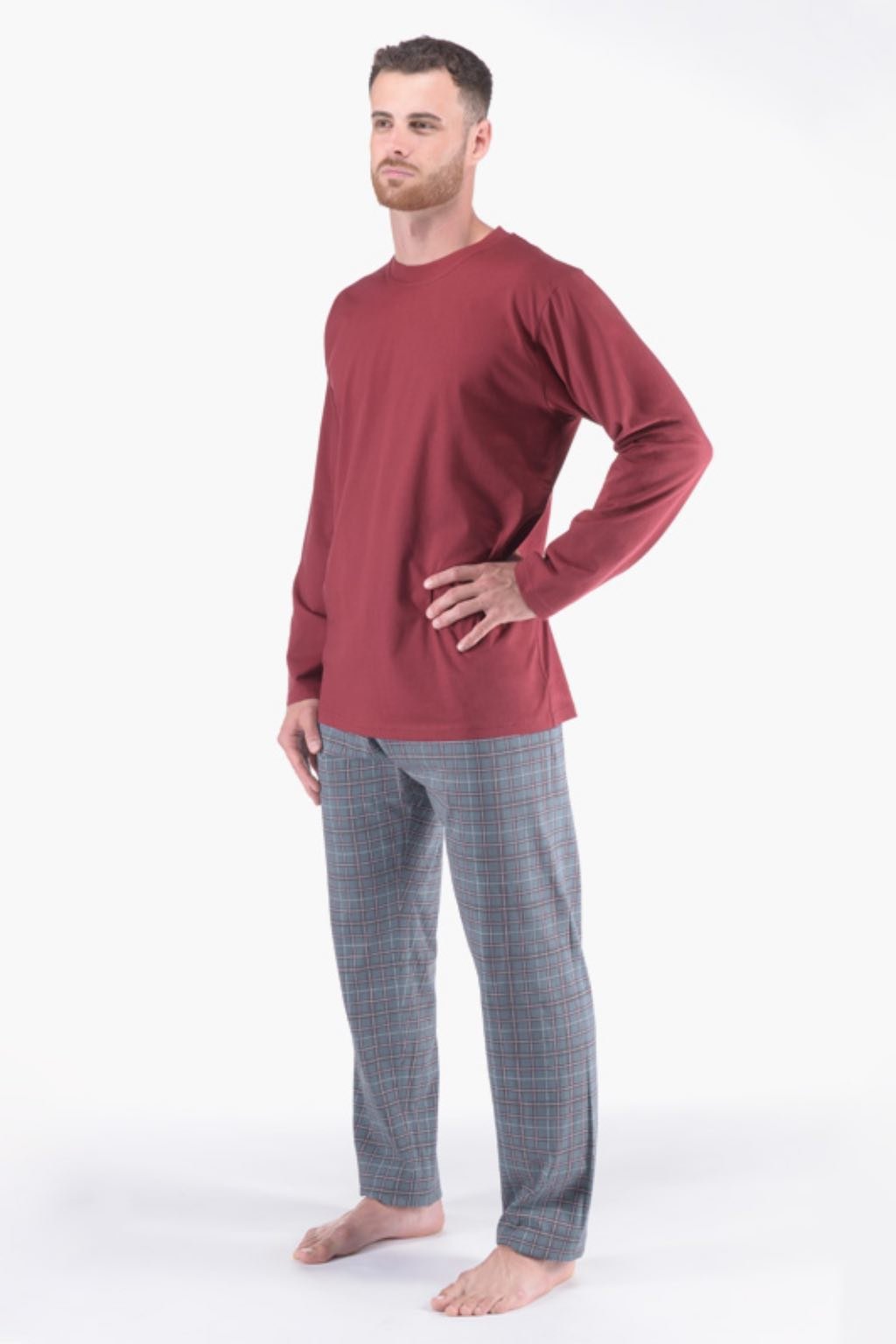 Vrchný diel tvorí bordové tričko s dlhým rukávom, ktoré sa pohodlne nosí a drží tvar aj po viacerých praniach. Nohavice majú károvaný vzor v odtieňoch sivej a bordovej a v páse sú doplnené o elastickú gumu, vďaka ktorej perfektne sedia.