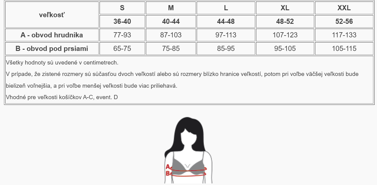 Odporúčanie: Ak sa vaše namerané hodnoty nachádzajú na hranici dvoch veľkostí, výrobca pri tomto type materiálu (bavlna s elastanom) zvyčajne odporúča zvoliť menšiu veľkosť pre lepšie spevnenie alebo väčšiu veľkosť pre vyššie pohodlie pri celodennom nosení.