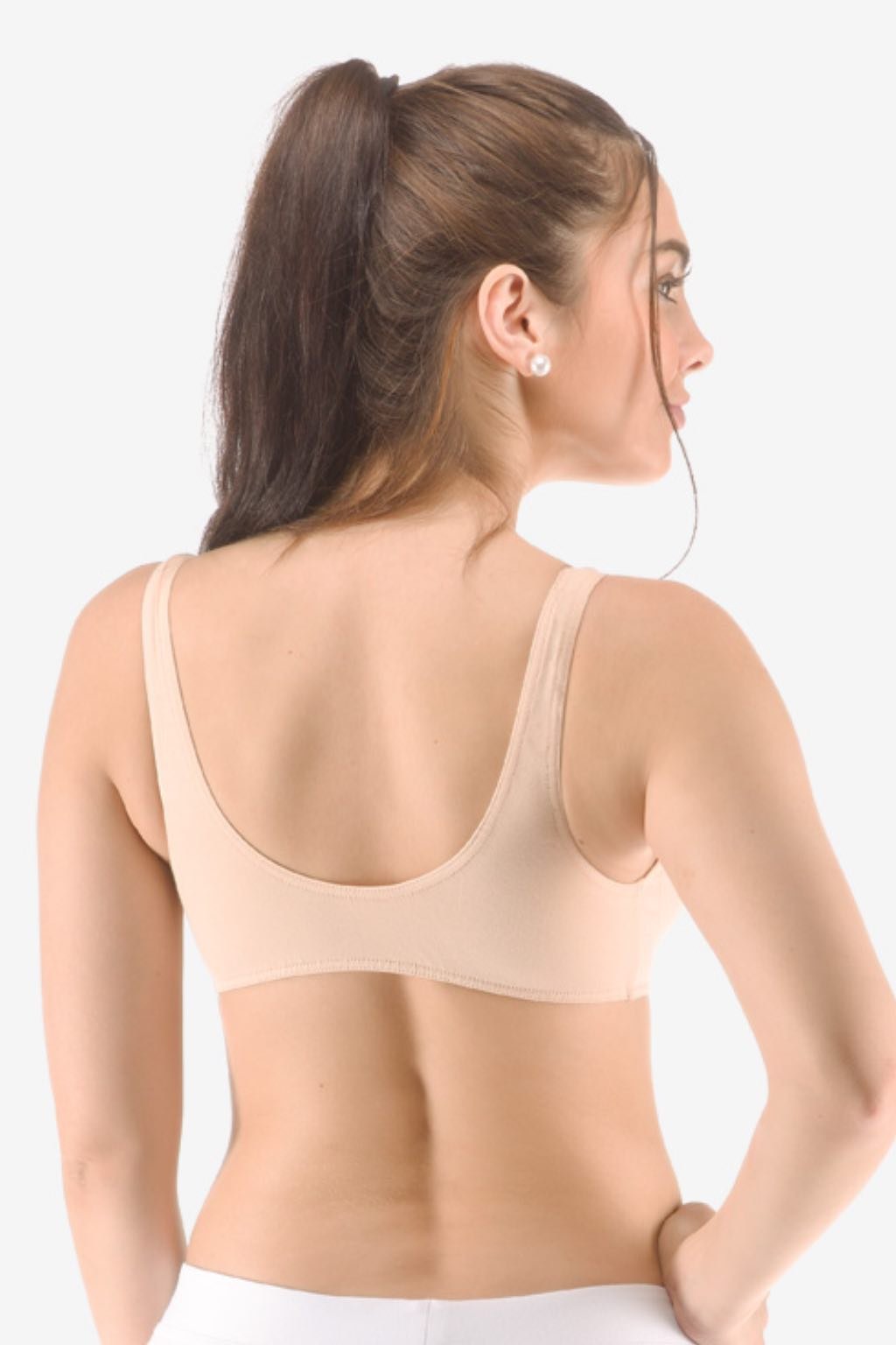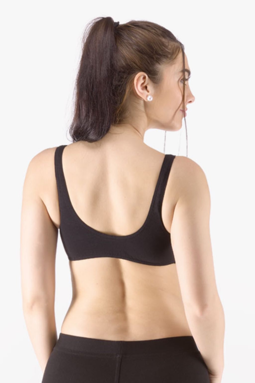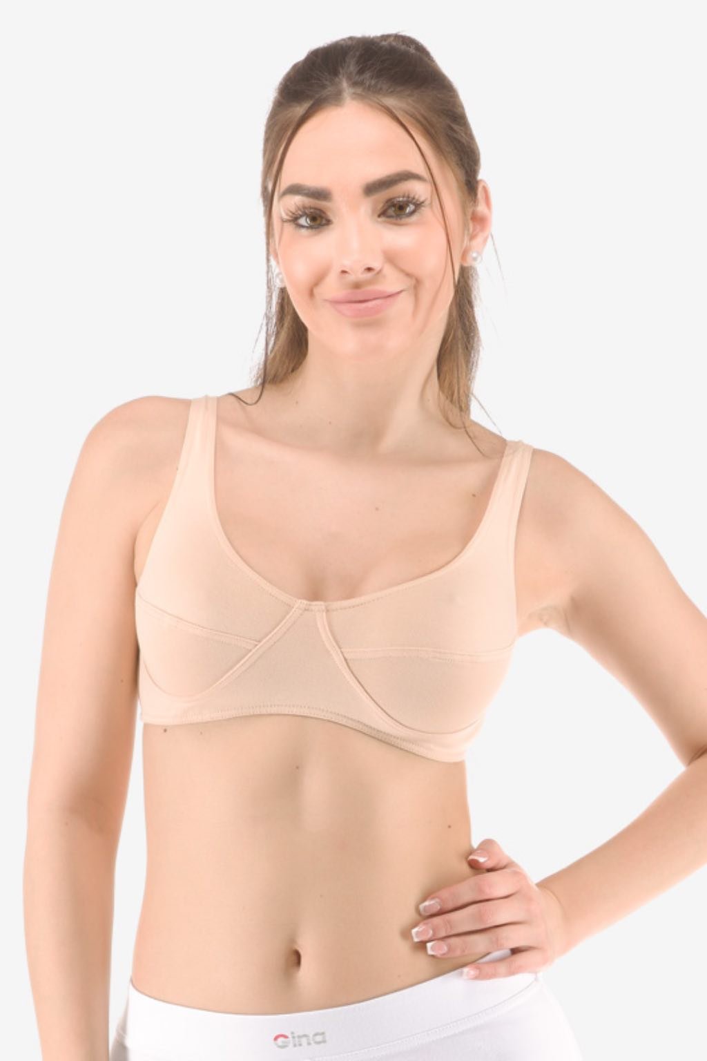 Strih.Šitá podprsenka GINA so širšími ramienkami a BEZ ZAPÍNANIA VZADU, oblieka sa cez hlavu (vhodná na šport aj bežné nosenie).